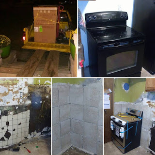 As part of the re-design of the kitchen we took out a weird pantry like cabinet and low and behold the wall had a metal plate screwed to the wall that clearly was were a gas range could vent out. That was ALL I needed to know. I was QUICK to go to Nebraska Furniture Mart and switch my electric stove we bought when we first bought the house to a new black and stainless steel gas stove. Phillip and I tiled the back and worked on fixing up the wall to make a nice clean galley kitchen that works for a growing family.